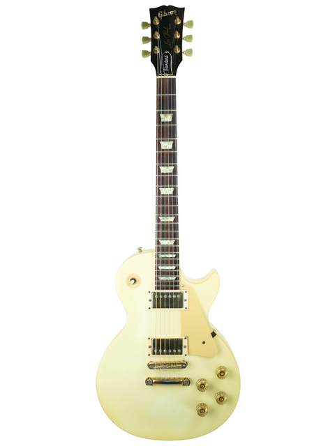 A vintage 1989 Gibson Les Paul Standard in Arctic White, prominently positioned on a stand.